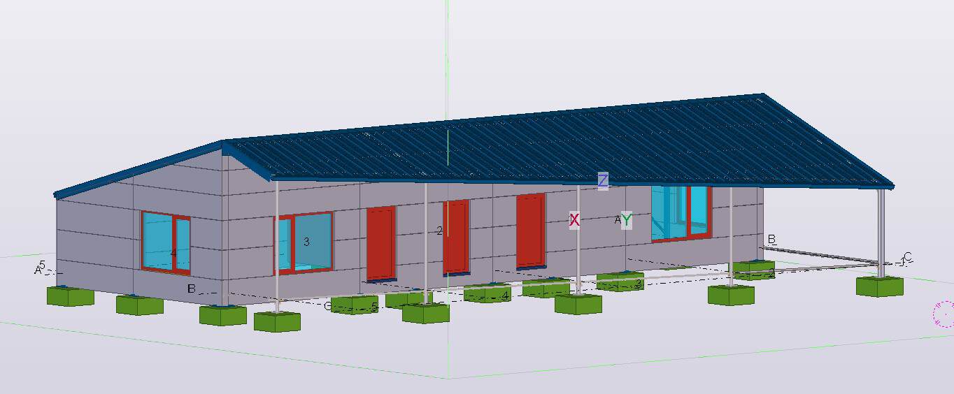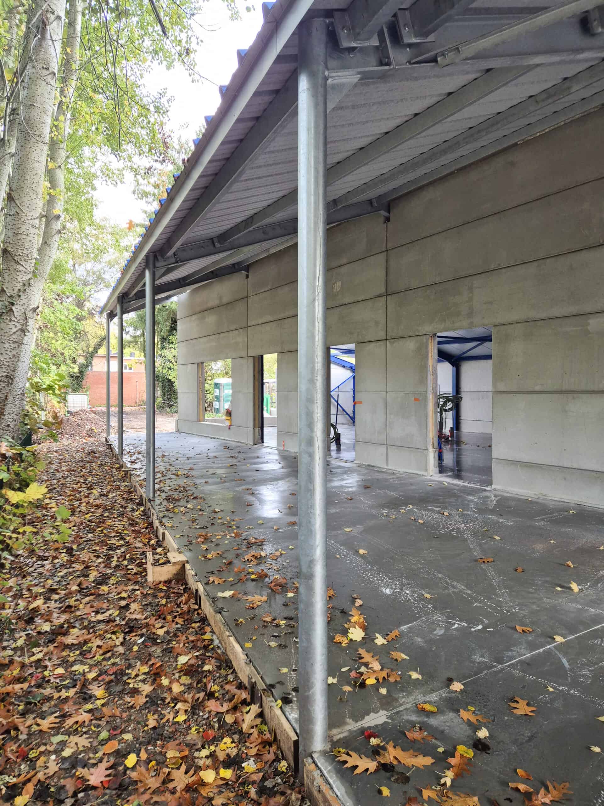 De nieuwe lokalen worden opgetrokken met een staalstructuur, afgewerkt met robuuste betonpanelen. Voor het dak is gekozen voor metalen sandwichpanelen die voldoen aan de geldende isolatie- en brandveiligheidsnormen.